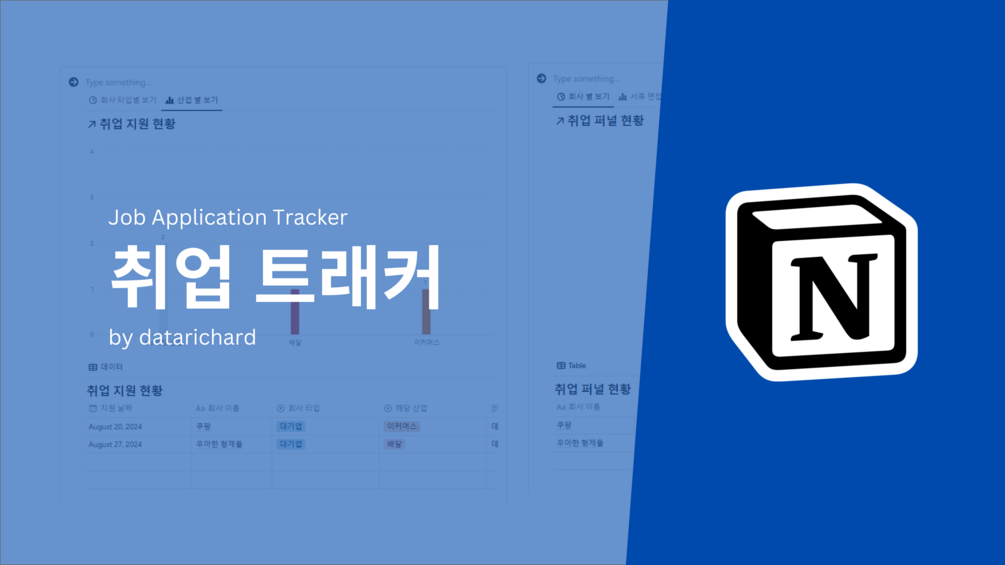 1. 지원 기업의 직무, 지역, 산업, 그리고 url까지 정리하여 저장할 수 있습니다.2. 각 취업 과정 및 단계의 진행 상황을 쉽게 추적하고 관리할 수 있습니다.3. 취업 단계 중, 어느 단계에서 내가 탈락했는지 또는 합격했는지,내 이력서가 어느 분야에서 더 높은 합격률을 보이는지를 그래프와 차트를 통해 한눈에 알아볼 수 있습니다.제작자: datarichard